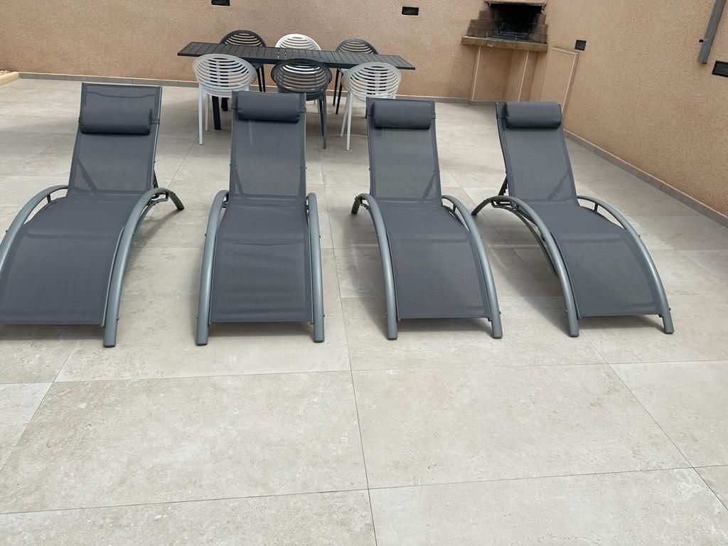 There is a private Swimming pool with roman steps 8x4 meters in size . A large sun terrace with sun loungers for lazing by the pool. Patio furniture perfect for dining Al fresco . There is also a barbecue . A private driveway for off street parking